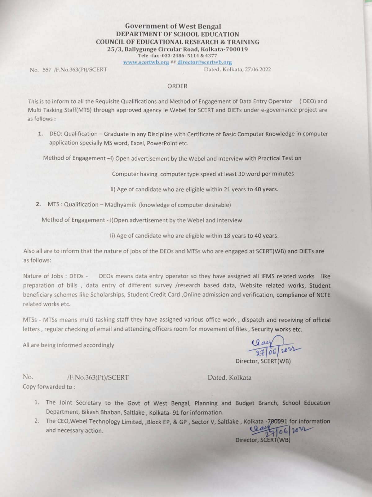| Order regarding engagement of Data Entry Operator (DEO) & Multitasking Staff (MTS) through approved agency Webel for SCERT and DIETs under e-Governance Project | No. 557/ F. No. 363 (Pt)/ SCERT Dated: 27.06.2022 | 27.08.2025 |